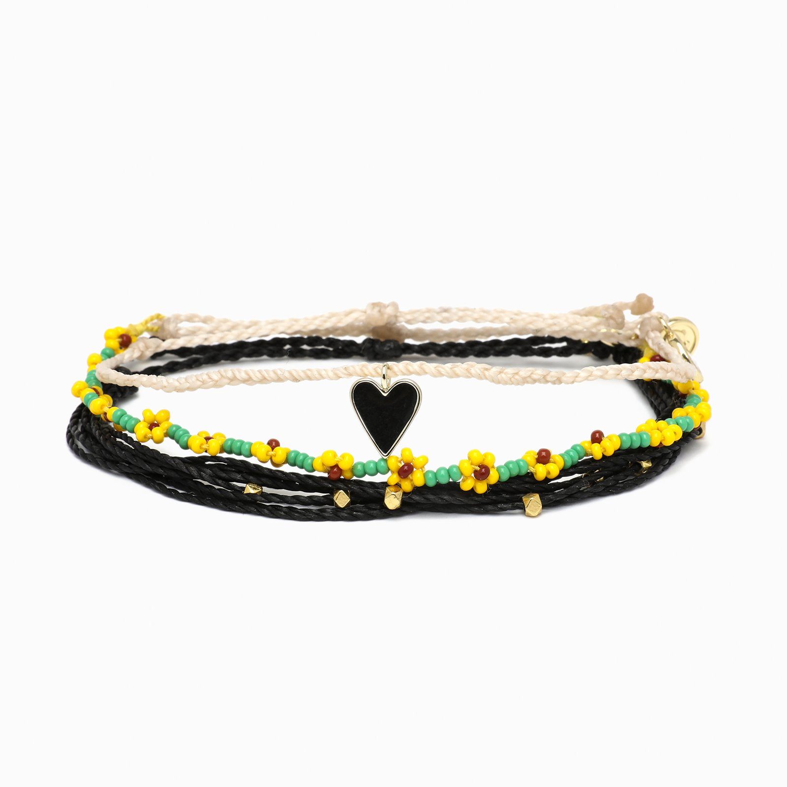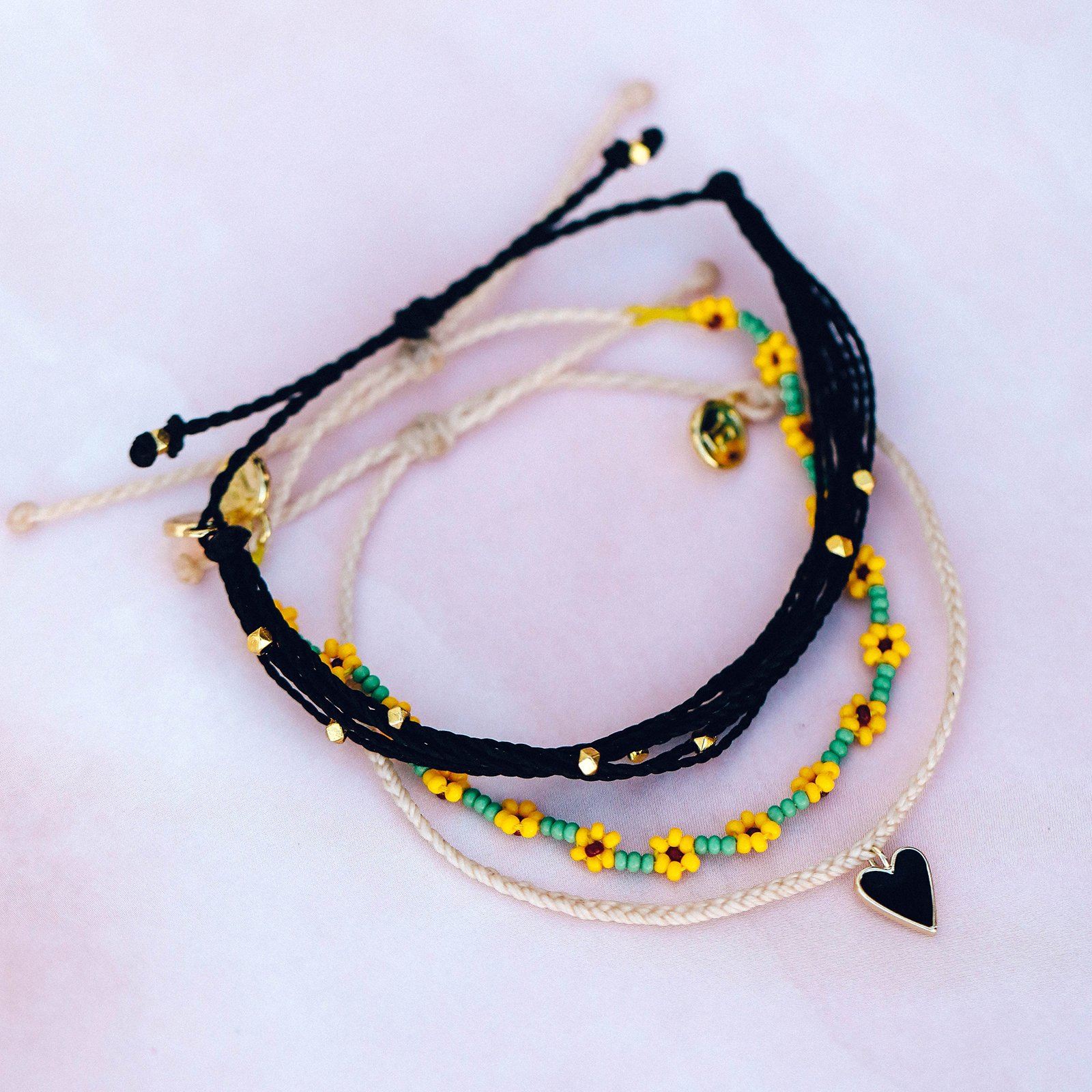 Add some edge to your sweet summer style with our new Sunflower Pack! This set of three best-selling bracelets includes a bold black Malibu design, the Sunflower Seed Bead Bracelet and the super-cute Petite Heart Bracelet.