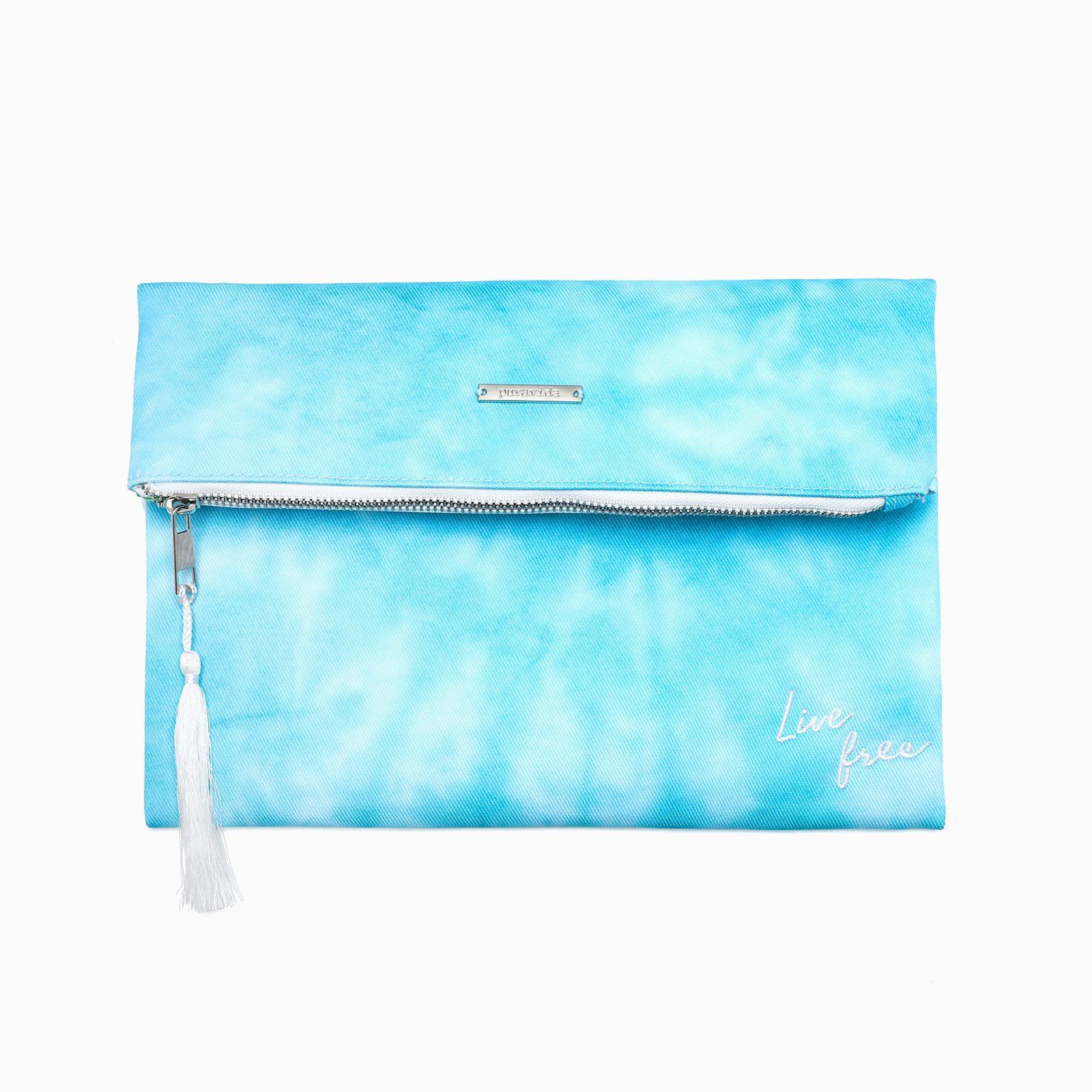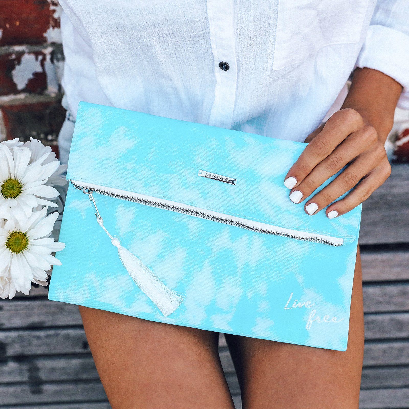 Who knew retro style could be so chic?! This foldover design features a ’70s-inspired turquoise tie dye pattern—plus a tasseled zipper and our “Live Free” motto—for an eye-catching look you’ll want to carry all summer long.